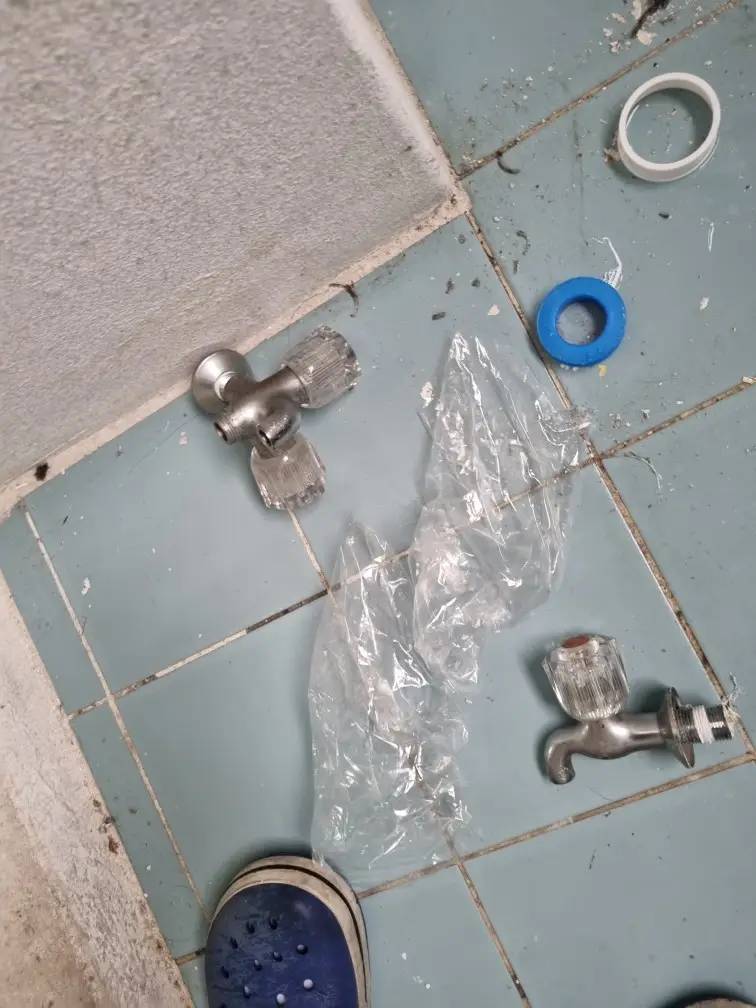 현장에 도착하자마자 먼저 세탁기 급수 호스를 분리하고, 주변을 덮을 비닐과 걸레를 준비했습니다. 이후 집 전체의 메인 밸브가 아니라 세탁실 라인을 담당하는 부분 밸브를 찾아 잠가 물 공급을 차단했습니다. 오래된 수도꼭지를 교체할 때는 배관 안에 남아 있는 압력 때문에 물이 튈 수 있으므로, 미리 레버를 열어 잔수를 빼두는 것이 중요합니다. 플라스틱 손잡이는 손으로 돌리다가 부러질 가능성이 높아, 드라이버로 커버를 눌러 분리한 후 내부 고정 나사를 풀어 제거했습니다.